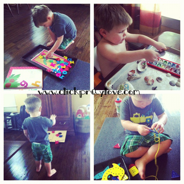 I know many of you area always on the lookout for new toddler activities. Click. Pray. Love. has shared some with us before and I was peeking at her blog the other day and noticed her series on Toddler Trays.
