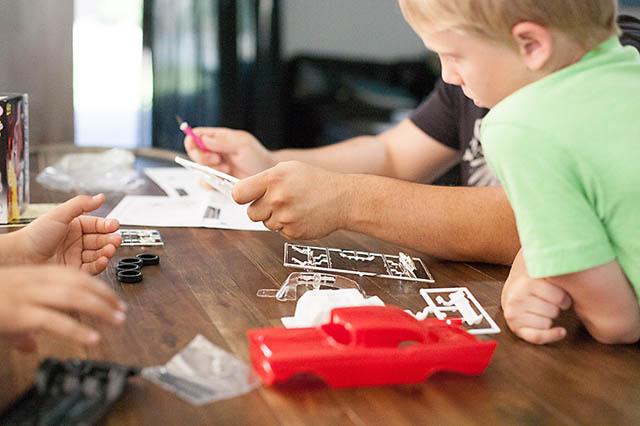 One of the things my husband used to do with his dad was build model cars. The boys were super excited to get the chance to work on some Revell SnapTite® model kits that they picked out together. The fun thing is that Jared (my husband) used this same brand when he was a kid. He got to tell the boys how they didn’t have the SnapTite® models when he was a kid and he wished they had!