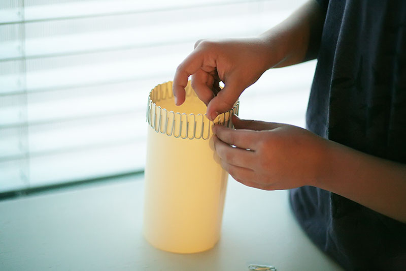Then place the paperclips on the end. The trick is making sure they are evenly spaced (again the weight issue) so we just put them all facing the same direction and touching.