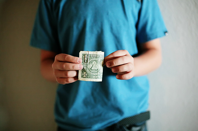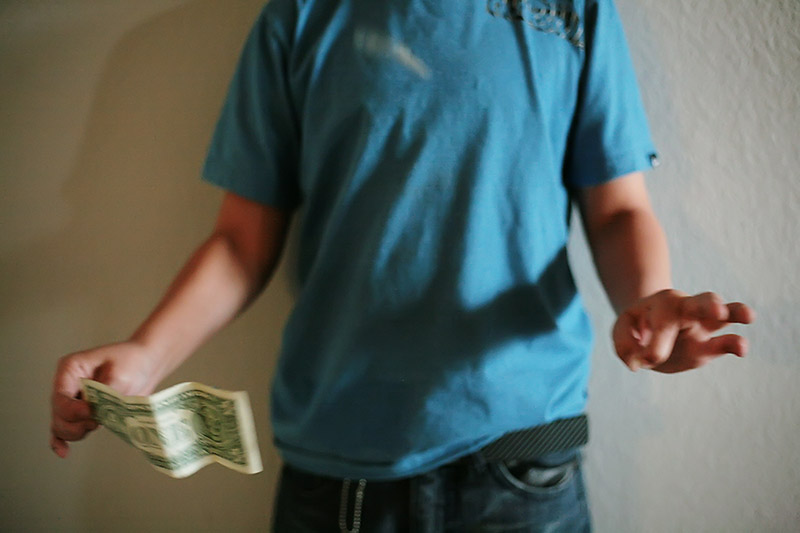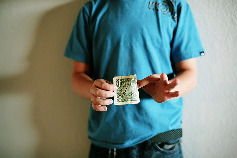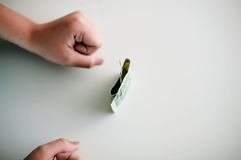 Take your bill and hold one end in each hand, just the non folded part you won’t have any fold in your hand.