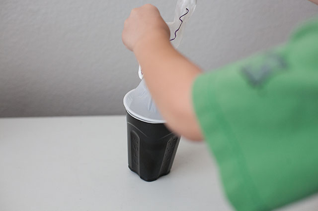 When you’re ready, pull up the fingers so the baking soda dumps into the cup