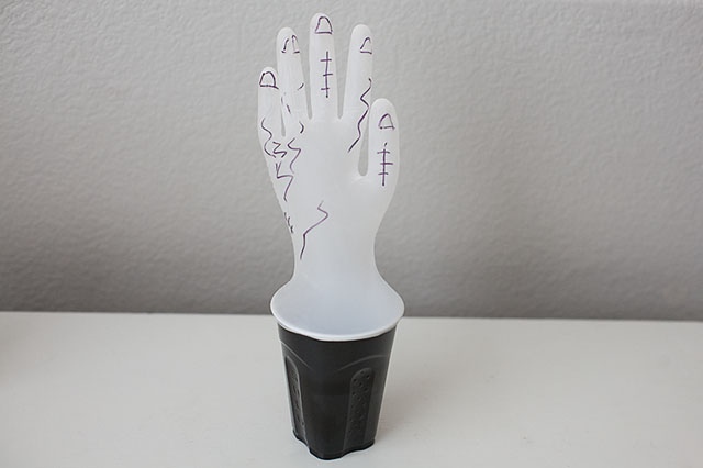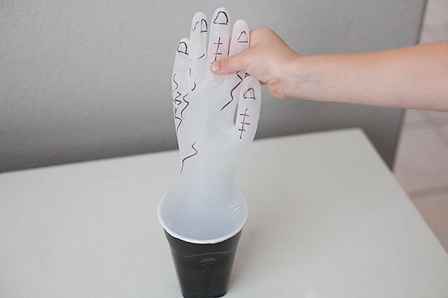 You’ll need baking soda, vinegar, a latex or vinyl glove, and a cup.