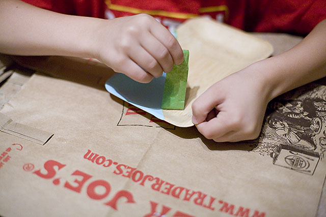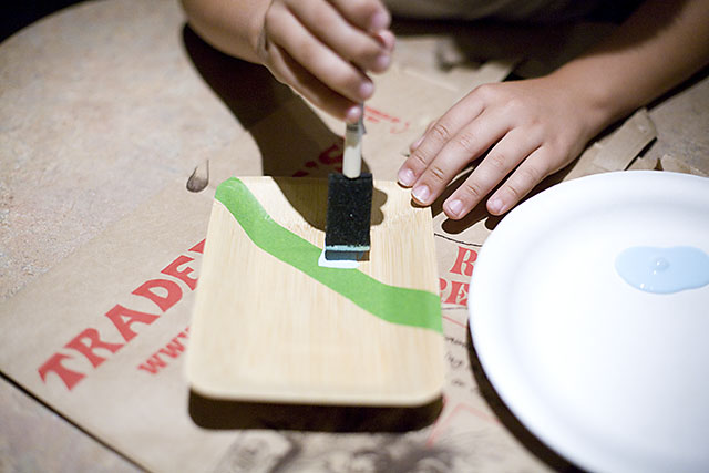 Both boys (7 and 9) approved of this easy craft and now want to make one of their own. Even if you have a younger child the different brush strokes and painting “techniques” can look cool when taped off into a design.