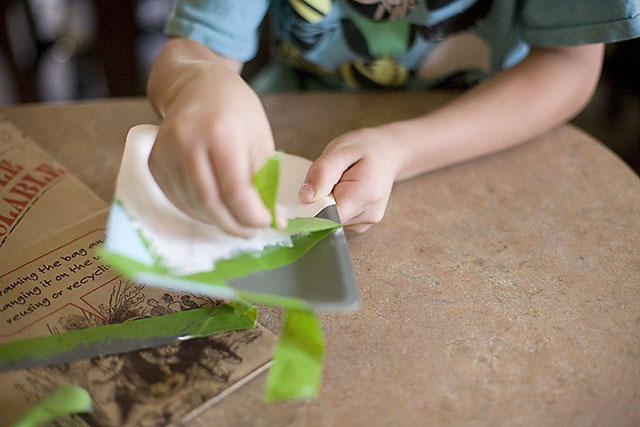 Flatten with a rolling pin (we covered it in plastic wrap so as not to get dough in the pin). You can flatten thinner than my boys did but I didn’t want to direct too much on this project.