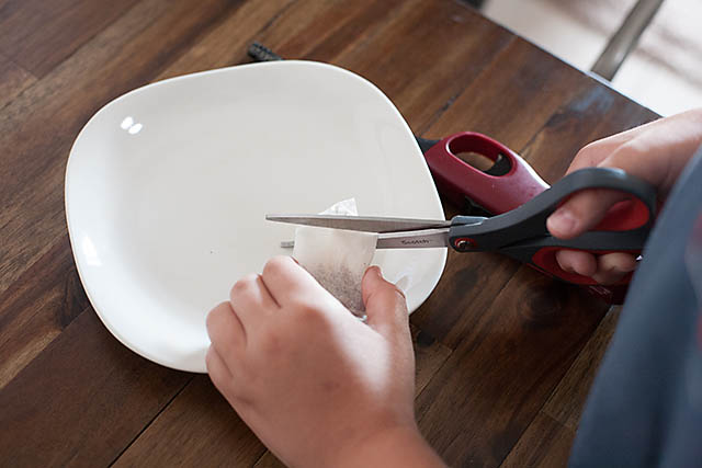 You’ll need an new tea bag (not used), scissors, a non-flammable plate or surface and a lighter of some sort.