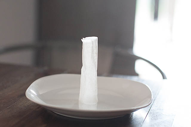 Stand it up on it’s end on the plate or other non-flammable surface.